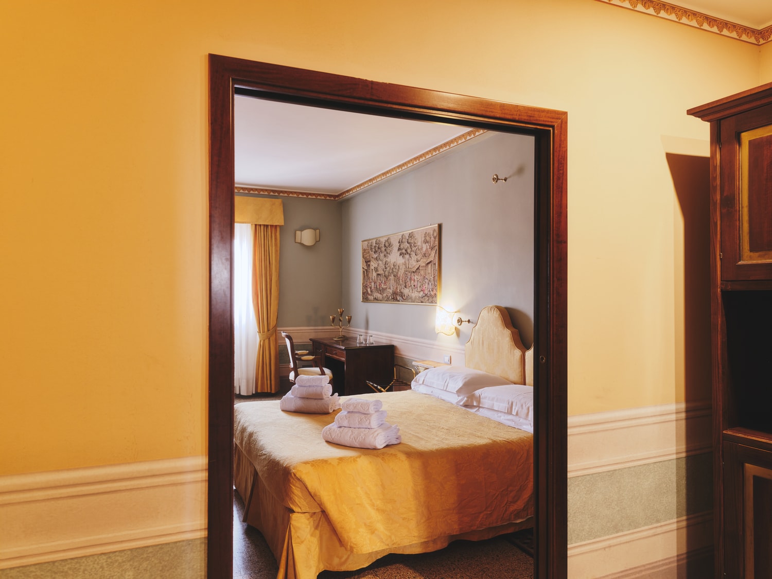 Spaziose e raffinate, le Junior Suite offrono ambienti ampi e luminosi, arricchiti da eleganti letti con baldacchino e area relax dedicata.